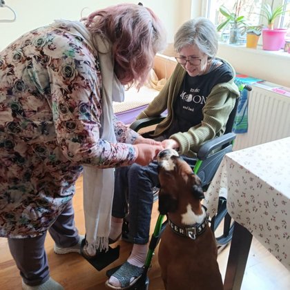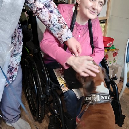 We wtorkowy poranek, tuż po śniadaniu na naszych Mieszkańców czekała niezwykła niespodzianka. Do Domu przyjechała instruktorka ze swoim psem rasy bokser - Fioną. W trakcie spotkania Podopieczni mogli dowiedzieć się o pielęgnacji i właściwym żywieniu psów. Każdy mógł pogłaskać i dać smaczka Fionie. Zwierzę przytulając się do Nas pomogło Nam złagodzić stres, napięcia, negatywne emocje. Dzięki niemu nawiązaliśmy ze sobą pozytywne, bliższe relacje oraz poprawiliśmy swoje zdrowie fizyczne i psychiczne. Podczas sesji dogoterapii, Fiona dała Nam ogromne wsparcie i wiele wspomnień z przeszłości z naszymi czworonożnymi przyjaciółmi.