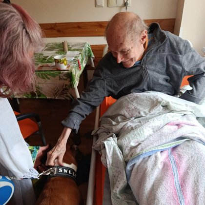 Tym razem Fiona odwiedziła Mieszkańców naszego Domu w ich pokojach. Podopieczni byli tak szczęśliwi, że uśmiech nawet na chwilę nie znikał z ich twarzy. Mogli oni przytulać się do psa – terapeuty i karmić go smaczkami. Mieszkańcy już nie mogą doczekać się kolejnego spotkania z czworonożną przyjaciółką!
